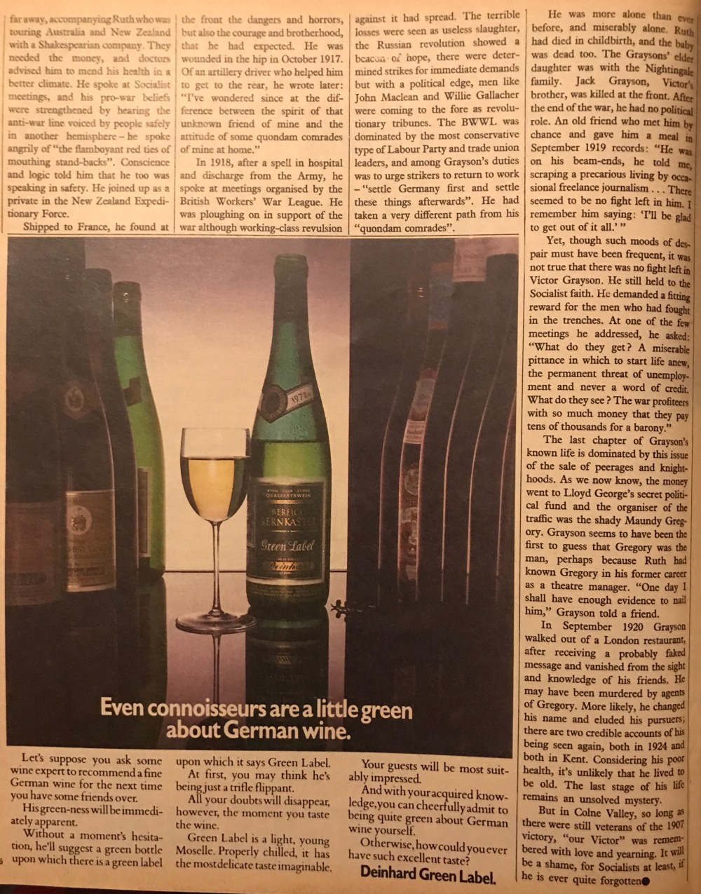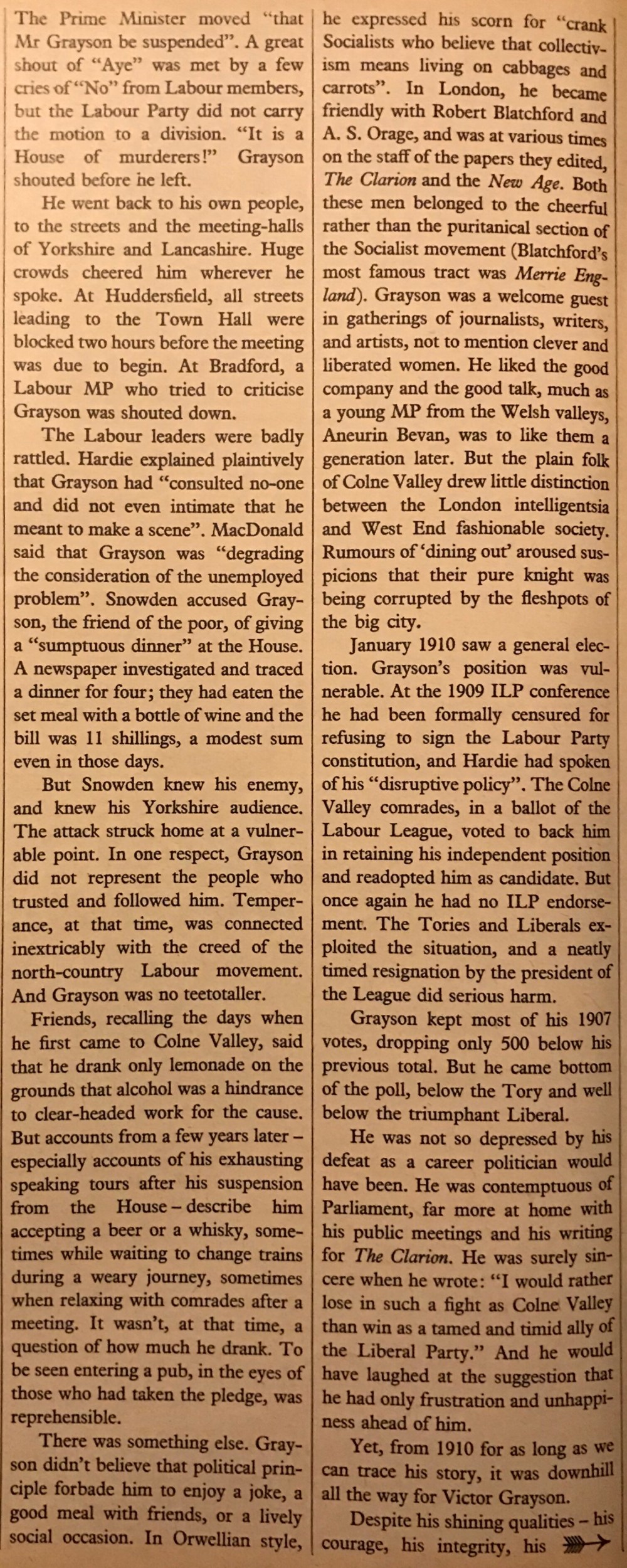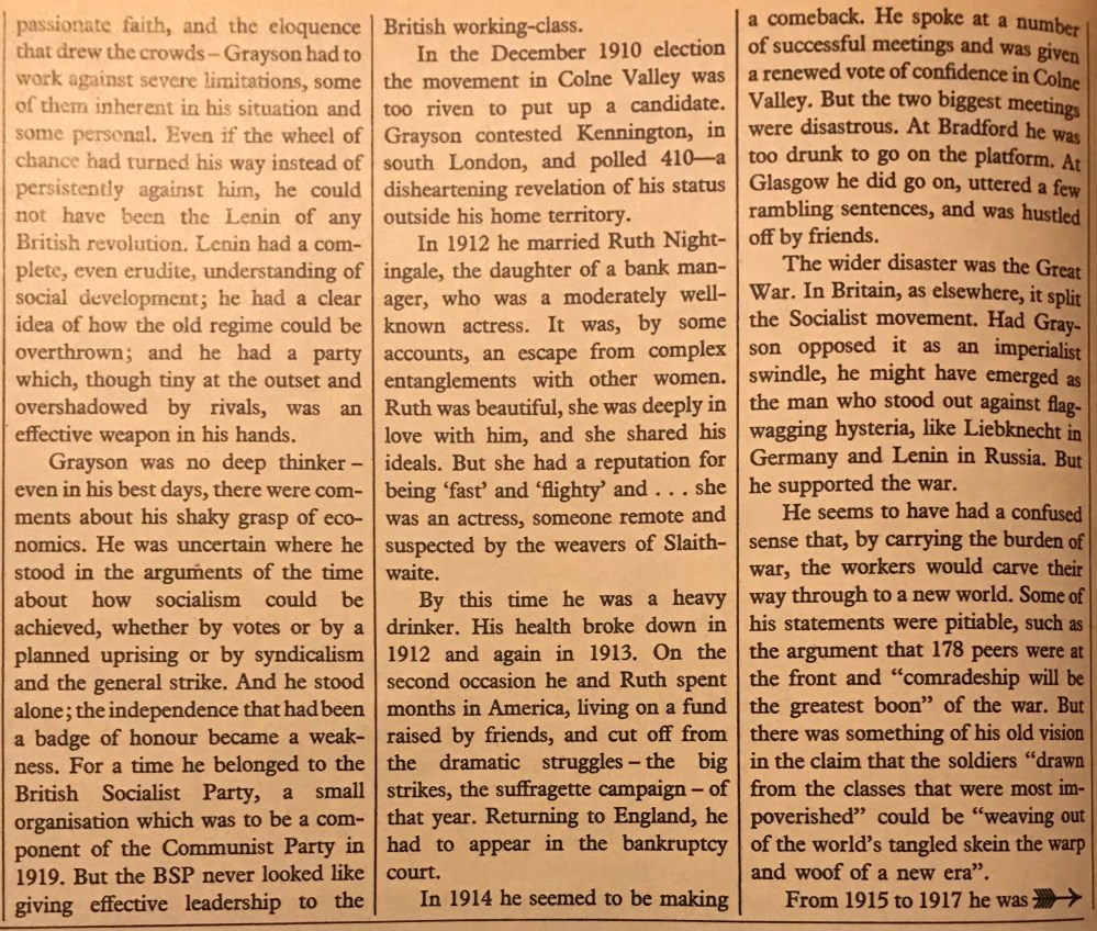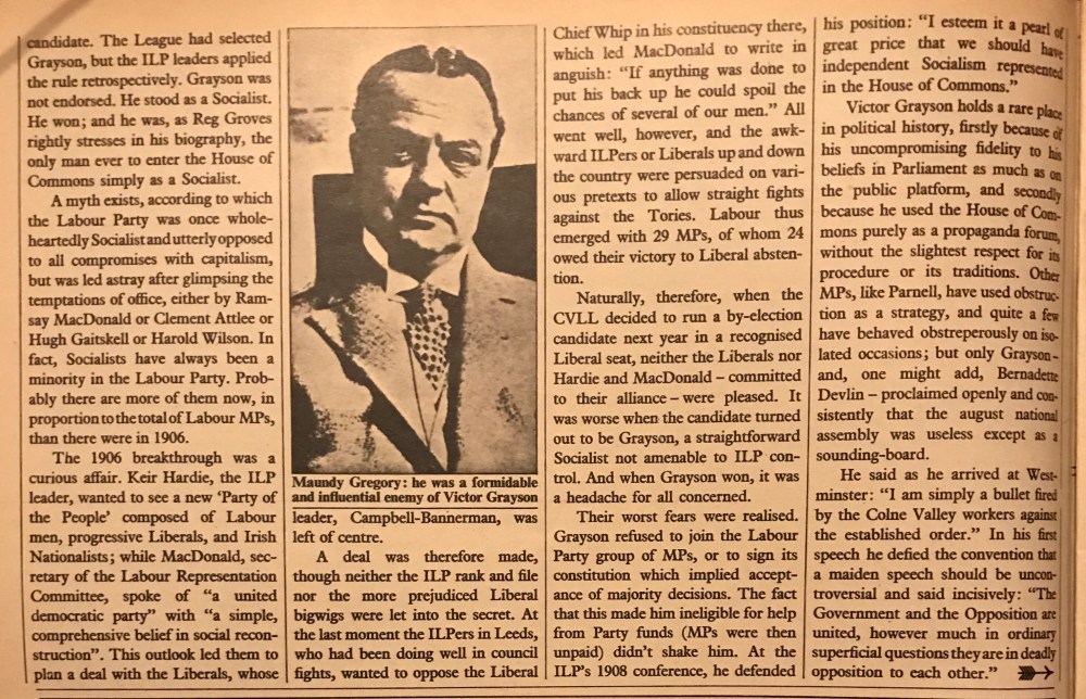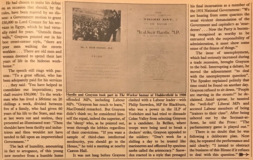 Below is a copy of the feature article on Victor Grayson from the Sunday Times Magazine (July 13th 1975). The piece appeared to coincide with the publication of Reg Groves’ second Grayson biography.